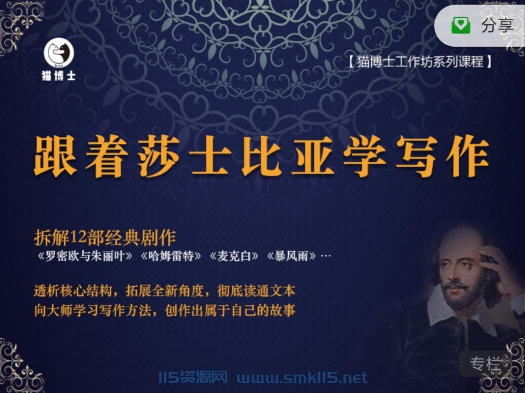 这是猫博士“名著:从阅读到写作”系列课程的第一个系列课题。讲透1部莎士比亚的经典剧作,全年总共讲12部。之所以采取“月更”的方式,是为了给大家留出充分的阅读、思考和创作时间。课程中,拆解结构,读透莎士比亚12部经典剧作 拓展思路,向大师学习写作的方法与技术,首先从阅读的角度,拆解剧作,透析故事结构、人物结构、叙述结构与世界结构,并且延伸到拥有类似结构的其他作品。这个部分会以视频课程的方式呈现。然后再从写作的角度,思考我们可以向莎士比亚学习哪些方法,灵活运用之前所拆解出来的各种结构,尝试展开新的创作。